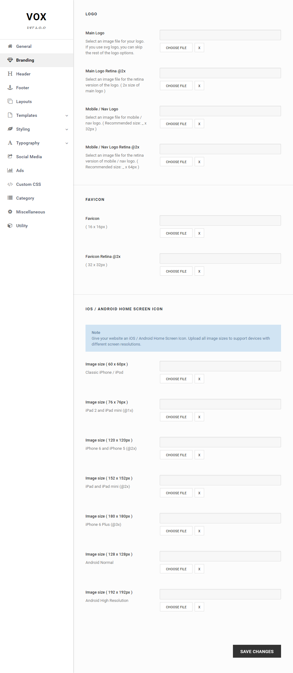 1. Navigate to Vox > Theme Options > Branding > iOS/Android Home Screen Icon section to access home screen icon options.